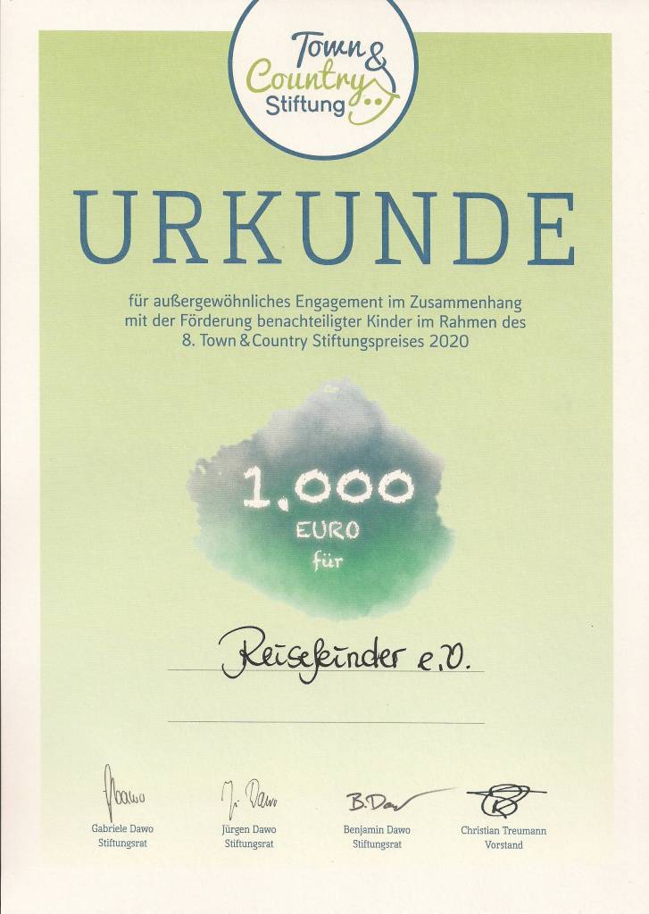 Wir haben durch die „Bewerbung“ um den Stiftungspreis der Town & Country Stiftung auch in diesem Jahr eine Finanzspritze in Höhe von 1000 € für unsere Vereinskasse erhalten.